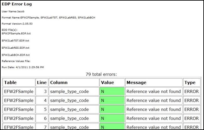 Error Log – The Error log exports an HTML file displaying each section, row, and column with an error. The error type is also displayed with color coding consistent with those displayed in EDP.