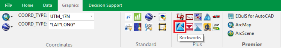 2.Open the RockWorks interface by selecting the Graphics tab on the EQuIS Ribbon. RockWorks is located under the Plus section of the EQuIS Graphics Ribbon.